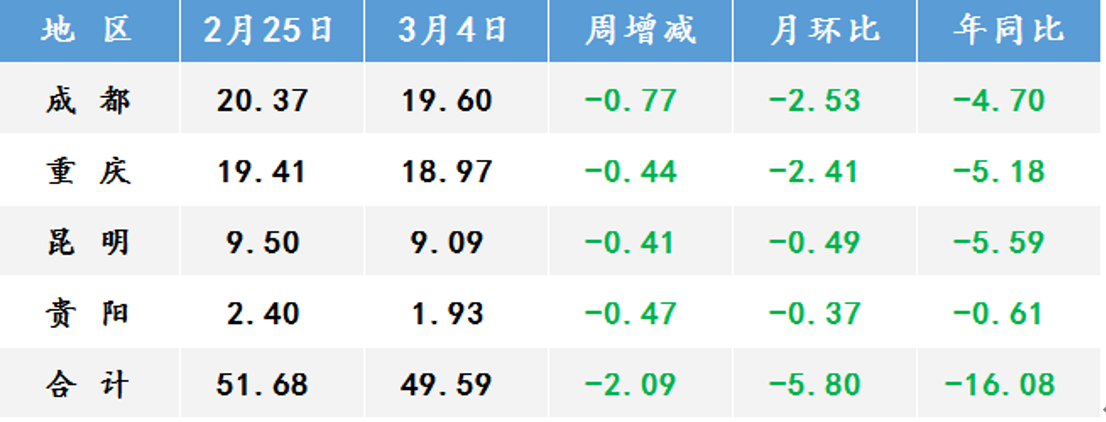 本周西南地区螺纹钢现货价格大幅上涨,终端需求逐步释放,商家投机划库气氛活跃,整体成交氛围持续改善。资源方面,西南区域内电炉钢厂已陆续复产,但受制于废钢资源紧张价格坚挺以及部分钢厂技改尚未投产等影响,整体产量增加有限。近期钢厂出厂价格坚挺,商家受补库成本较高等影响,多消化自有库存,本周成都地区社会库存降幅扩大,其余市场继续增库。